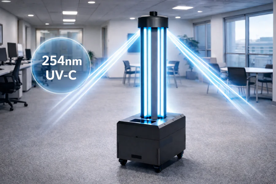 The robot operates at a 254nm UV-C wavelength, a scientifically validated range proven to neutralize a wide spectrum of pathogens.
